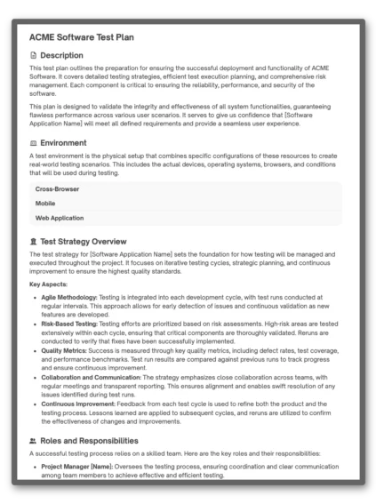 Forget templates and spreadsheets. TestQuality's FREE test planner helps you build a world class test plan to drive your software QA testing strategy, goals, and milestones.